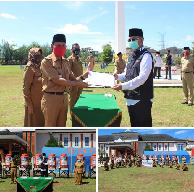 Bupati Musi Rawas Provinsi Sumatera Selatan,H Hendra Gunawan didampingi Wakil Bupati Hj Suwarti Burlian melakukan penyerahan secara Simbolis Alat Cuci Tangan & Hidran Umum dari Pemerintah Kabupaten Musi Rawas untuk masyarakat terdampak Covid-19. Selasa (02/06/2020) di Halaman Pemkab Mura.