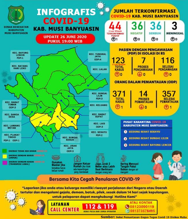 Gugus Tugas Penanganan Covid-19 Kabupaten Musi Banyuasin, Jumat (26/6/20) mengkonfirmasi penambahan satu kasus positif covid-19.
