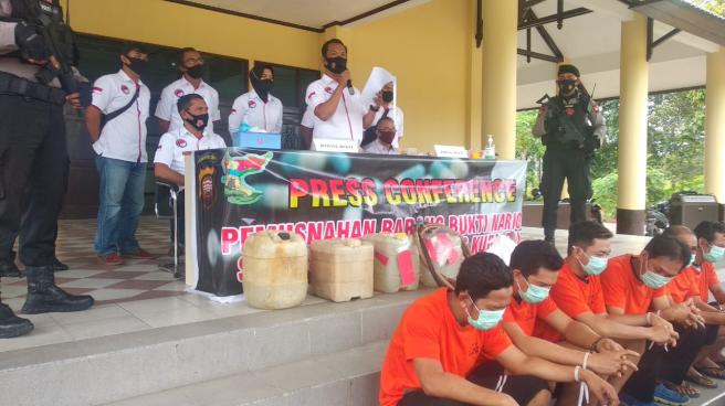 "Selama Agustus – September 2020, diungkap sebanyak 6 kasus dengan tersangka berjumlah 6 orang laki-laki dengan barang bukti, sabu-sabu seberat 9,64 gram, Ekstasi sebanyak 1 butir seberat 0,57 gram, serta Miras jenis arak putih sebanyak 80 liter, dan yang telah dimusnahkan di lokasi 11 drum.