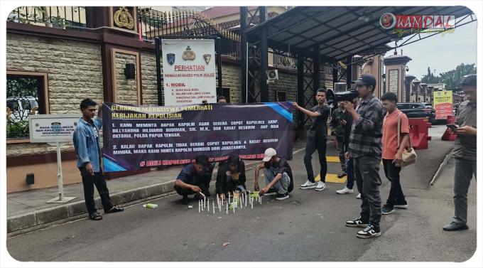 Tabloidskandal.com – Jakarta || Ratusan Mahasiswa yang tergabung dalam Gerakan Mahasiswa Pemerhati Kebijakan Kepolisian (GMPKK) menggelar Aksi solidaritas terhadap Media Papuanewsonline.com di Papua yang dibungkam oleh Polres Mimika, Polda Papua Tengah, di depan Gedung Mabes Polri, Jakarta Selatan, Rabu (1/10/2025).