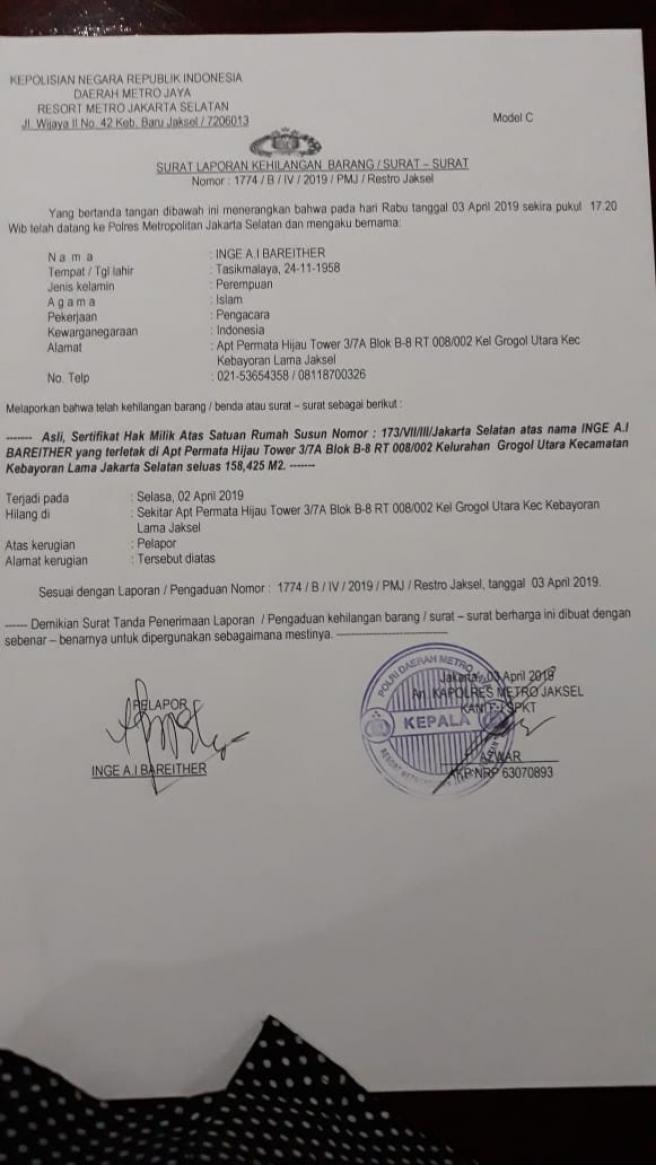 Inge A. I Bareither, seorang pengacara mengaku kehilangan Sertifikat Kehilangan Hak (SHM) Apartemen Permata Hijau, kawasan Simprug, Jakarta Selatan. Dia telah melapor Kepolisian Resor Metro Jakarta Selatan, dengan no LP. SL. No. 1774/B/IV/2019/PMJ/Restro Jakarta Selatan.