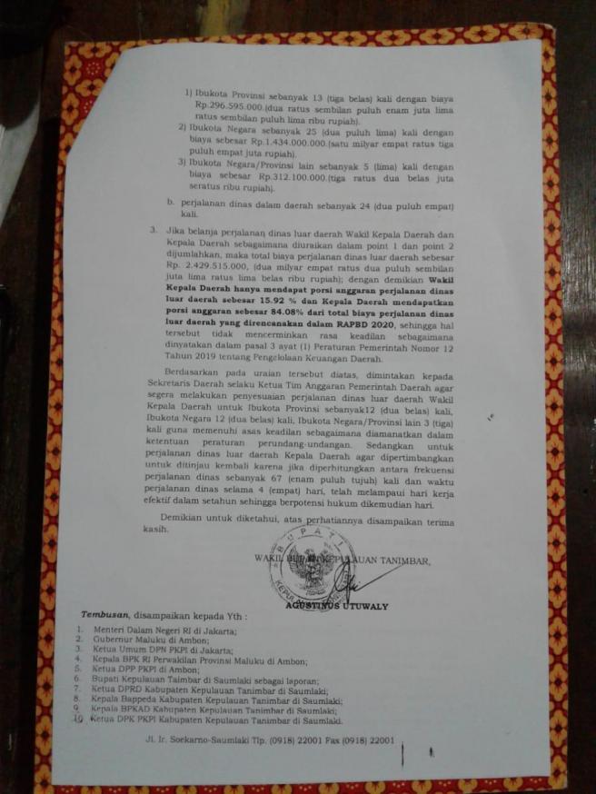 Baru-baru ini, beredar sebuah surat keberatan Wakil Bupati Kepulauan Tanimbar, Agustinus Utuwaly, yang meminta kepada Ketua Tim Anggaran Pemerintah Daerah (TAPD) KKT, Piterson Rangkoratat, agar mengevaluasi kembali Anggaran Perjalanan Dinas Bupati Petrus Fatlolon yang dianggarkan dalam RAPBD TA 2020.