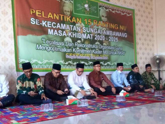 15 Pengurus Ranting Nahdlatul Ulama yang berasal dari 15 Desa di Kecamatan Sungai Ambawang dilantik dan diambil Sumpah janjinya sebagai Pengurus oleh Ketua PCNU Kabupaten Kubu Raya, KH Abdussalam, M.Si di Aula Kantor Desa Sungai Ambawang Kuala Jl Trans Kalimantan, Sabtu (22/08/2020).