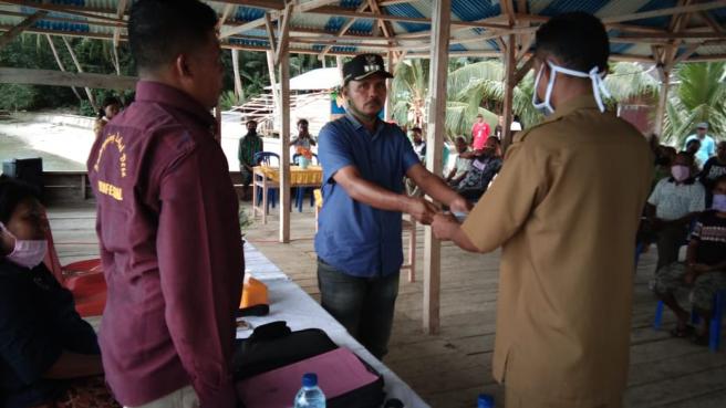 Camat Kei Besar Selatan J.P Ubra,SH menyerahkan secara simbolis Bantuan Langsung Tunai (BLT) kepada 6 Kepala Keluarga (KK) di Balai Ohoi Soindat, didampingi istrinya, Yulia.Ubra/H dan pendamping desa Erwin Ohoitenan, siang tadi, pukul 13, 00 WIT.29/05.