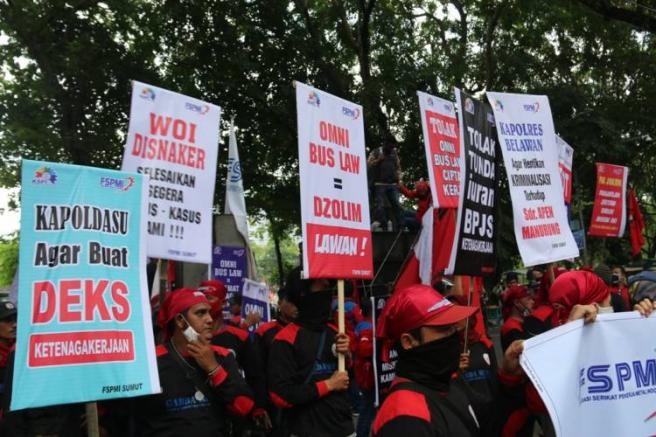 Demo Buruh tergabung dalam Federasi Serikat Pekerja Metal Indonesia (FSPMI) Sumut dan Serikat Buruh Merdeka Indonesia (SBMI) Merdeka, Selasa (25/8/2020) unjuk rasa ke Gedung DPRD Sumut, mengancam akan mogok massal, jika RUU Omnibus Law Cipta Lapangan Kerja tetap disahkan.