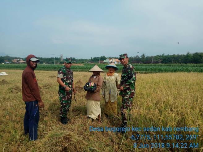 Hal inilah yang dilakukan oleh Danramil Sedan beserta anggotanya dalam mewujudkan rasa kekompakan dan persatuannya dengan masyarakat, dengan lakukan giat panen raya di lahan persawahan para petani di Desa bogorejo Kecamatan sedan Kabupaten Rembang Jumat (08/06/2018).