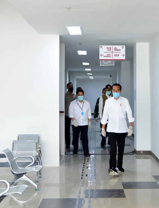 Turut mendampingi Presiden dalam peninjauan Wisma Atlet Kemayoran yaitu Menteri Badan Usaha Milik Negara Erick Thohir dan Ketua Gugus Tugas Percepatan Penanganan Covid-19 Doni Monardo.(JOE)