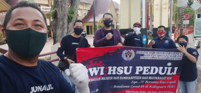 Dalam upaya membantu pencegahan wabah virus Covid - 19 Persatuan Wartawan Indonesia (PWI) Hulu Sungai Utara (HSU) menggelar kegiatan membagikan masker dan Hand Sanitizer.