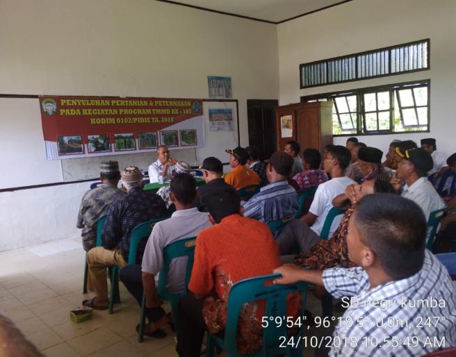 Dalam rangka turut mendorong terwujudnya masyarakat Indonesia yang sejahtera, Satgas TMMD Reguler ke 103 Kodim 0102/Pidie menyelenggarakan Penyuluhan Pertanian dan Peternakan di Desa Kumba Kec. Bandar Dua. Rabu, 24/10/2018