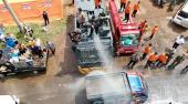 Penyemprotan cairan disinfektan oleh personil Batalyon C Pelopor.