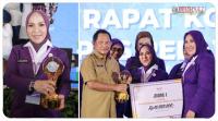 Hj Fathul Jannah Mengangkat Piala Juara Satu Nasional Dalam Lomba TP Posyandu 2025
