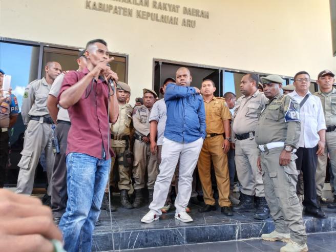 Masa pendemo diterima oleh Ketua DPRD Aru, Udin Belsigaway, Husein Tuberpon, Yanto Mangat dan Usman Labow di depan gedung DPRD Aru dan mendapat pengawalan dari Aparat Kepolisian Polres Aru dan Satpol PP Kepulauan Aru.