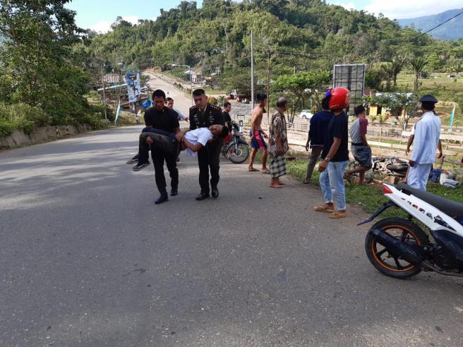Komandan Kodim 1417/Kendari Letnan Kolonel Cpn KRT Fajar Lutvi Haris Wijaya SE,.M.I.Pol mengevakuasi korban kecelakaan Laka Lantas menggunakan kendaraan dinas jabatan Dandim saat perjalanan mengikuti Upacara Peringatan Kemerdekaan RI KE-74 di Konawe Utara.Sabtu, (17/8/2019).