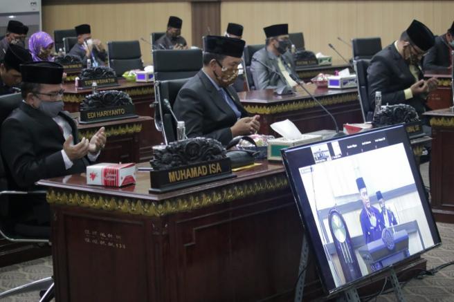 Dewan Perwakilan Rakyat Daerah (DPRD) Kabupaten Muba menggelar Rapat Paripurna Masa Persidangan II Rapat ke-10 tentang Penandatangan pengambilan keputusan bersama DPRD dan Bupati Muba serta Pendapat akhir Bupati Musi Banyuasin terhadap 6 (enam) Raperda Pemerintah Tahun 2020 di ruang rapat Paripurna DPRD pada hari Selasa (21/04/20).