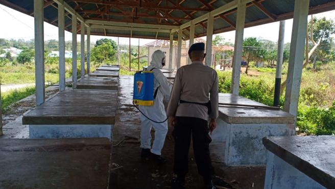Pagi tadi personil Brimob Kompi 1 Yon C Pelopor melakukan penyemprotan disinfektan di pasar baru desa mangon kecamatan dullah utara tual Kota Tual Jumat, (11/09/2020).