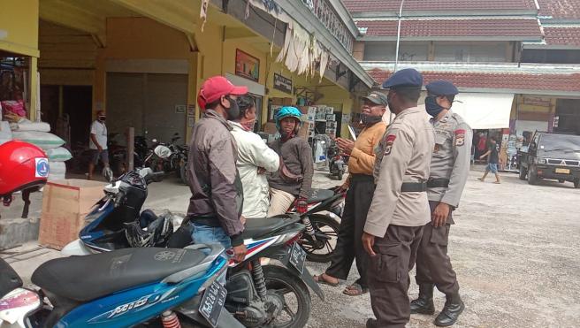 Personil Batalyon C Pelopor Brigadir Obet Luturmase dan Briptu irman Jailuhun terjun langsung di tengah masyarakat mensosialisasikan tentang New Normal kepada masyarakat Kota Tual dan Kabupaten Malra.