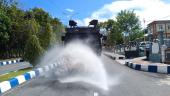 Kegiatan penyemprotan ini dipimpin oleh Bripka Roger Fautngilyanan dengan menggunakan satu unit kendaraan water canon, yang bertempat pada ruas Jalan Protokol Kota Tual, pelabuhan Yos Sudarso Kota Tual dan halaman kantor Walikota Tual.
