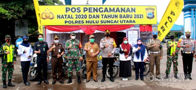 Memastikan operasi lilin Intan 2020 berjalan lancar, Forum Komunikasi Pimpinan Daerah (Forkopimda) Kabupaten Hulu Sungai Utara (HSU) meninjau pos pengamanan (Pospam) Natal dan Tahun Baru (Nataru) di beberapa lokasi di kota Amuntai. Senin (28/12/2020)