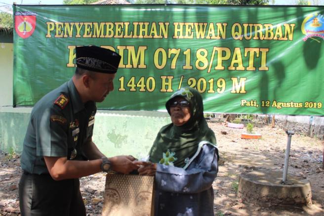 Dandim 0718/Pati Letkol Arm Arief Darmawan memberikan daging kurban kepada warga.