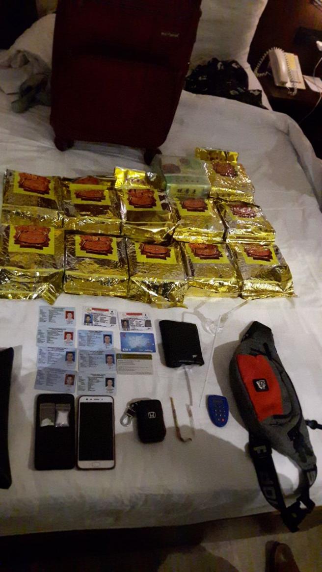 Barang bukti dari tersangka SE 25 bungkus yang masing- masing terdiri dari 5 bungkus the merk Guan Yin Wang dan 20 bungkus teh merek Kaisar Bintang Lima yang di dalamnya berisi Kristal putih diduga narkotika jenis sabu, 2 buah plastik klip transparan berisi kristal putih diduga narkotika jenis sabu berat bruto 1,98 Gram, 2 buah tas koper merk Hush Puppies warna merah, 2 buah tas (hand Bag) merk Sport warna hitam, 1 buah tas selempang merk Proshop warna abu-abu hitam, 1 buah alat hisap sabu (bong) terbuat dari botol kaca, 1 buah alat token BCA warna biru, 1 unit HP Oppo F3 warna putih, 1 unit HP Pocophone warna hitam, 6 buah KTP palsu, 1 buah kartu ATM BCA, 1 buah dompet.