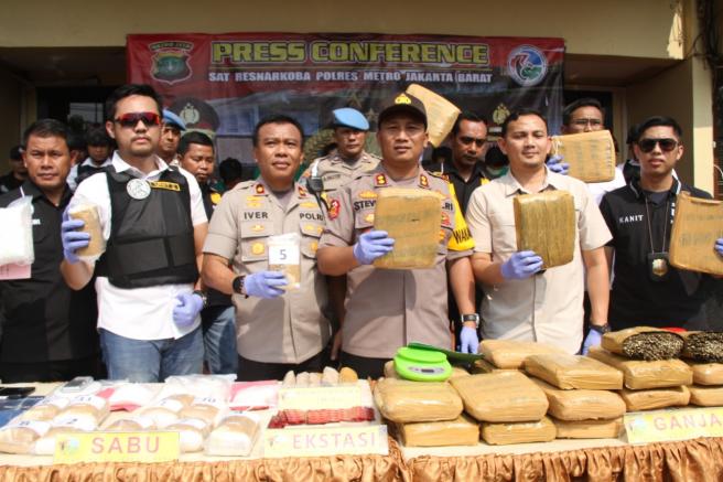 " Sebanyak 7 pelaku berhasil diamankan dari 4 kasus yang berbeda dengan total barang bukti sebanyak 13 kg narkoba jenis sabu, 34 kg narkoba jenis daun ganja, sebanyak 200 butir Pil Ekstasi, dan 220 butir pil Happy Five ( H5 )", ujar Wakapolres Metro Jakarta Barat AKBP Stefanus Michael Tamutuan, Kamis (26/12/19).